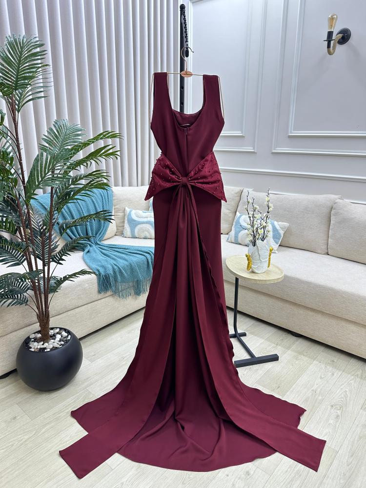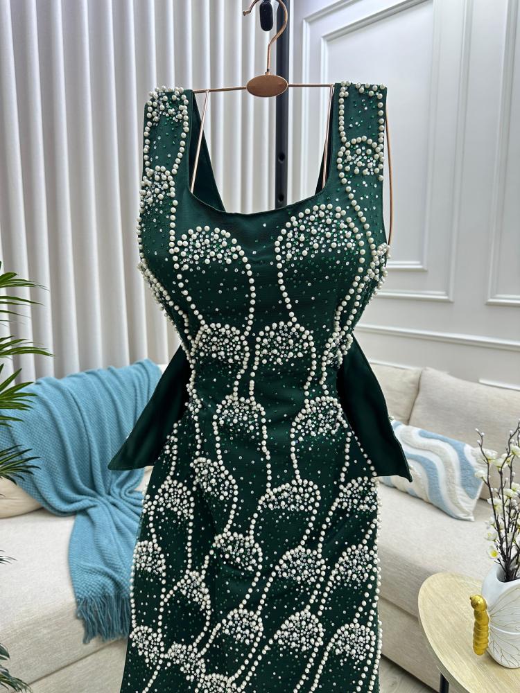 فستان سهرة أخضر بنقشة أوراق وفتحة جانبية