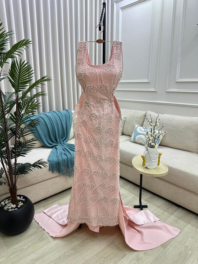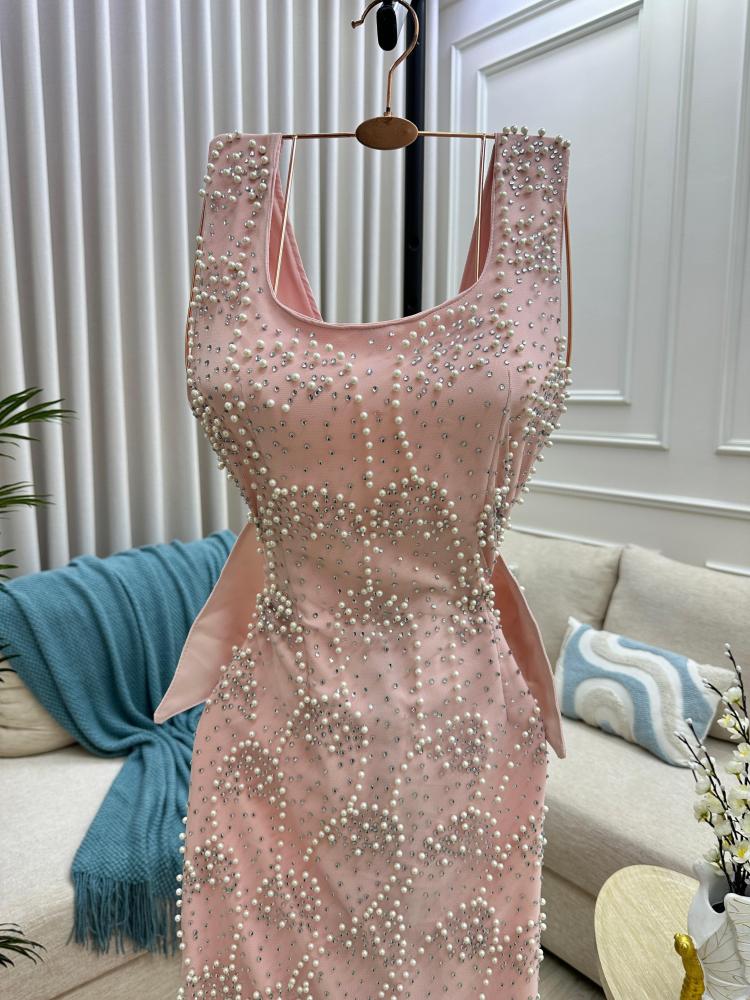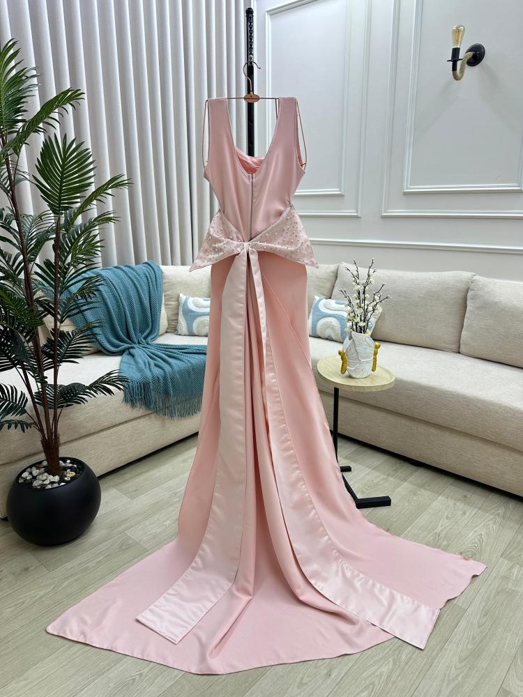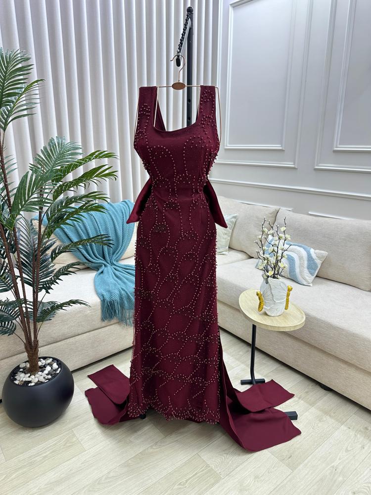 - القَصّة: بدون أكمام، صدر ضيق وتنورة مستقيمة بشق جانبي، تصميم جريء بنقشة طبيعية