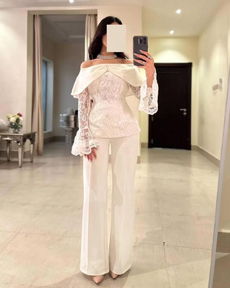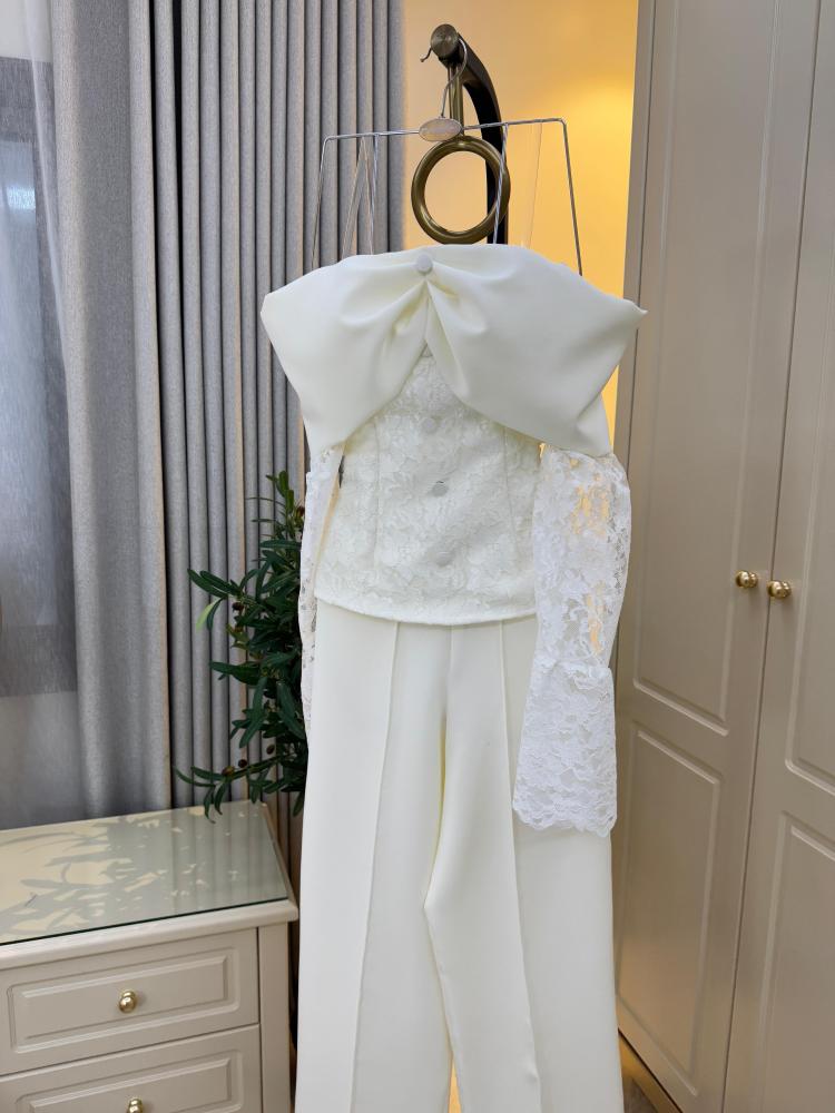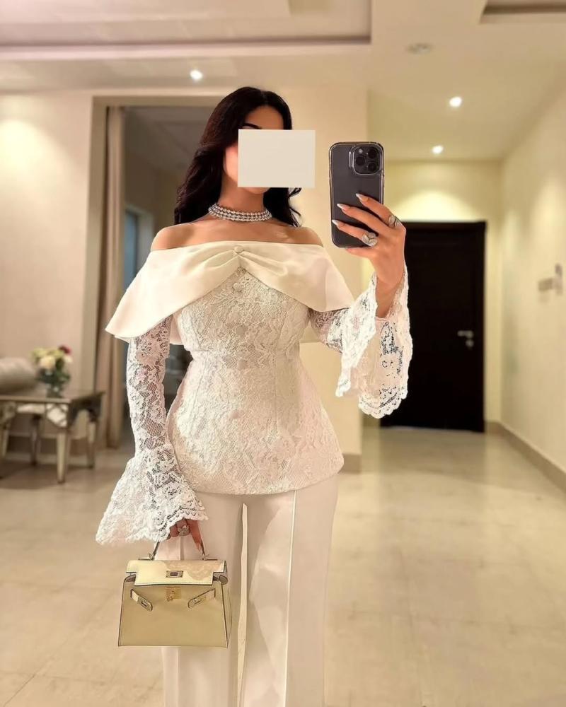 طقم أبيض بكم منفوش ودانتيل ، تصميم عصري بلمسات أنثوية ناعمة، مصنوع من الدانتيل الفاخر والتول الشفاف.