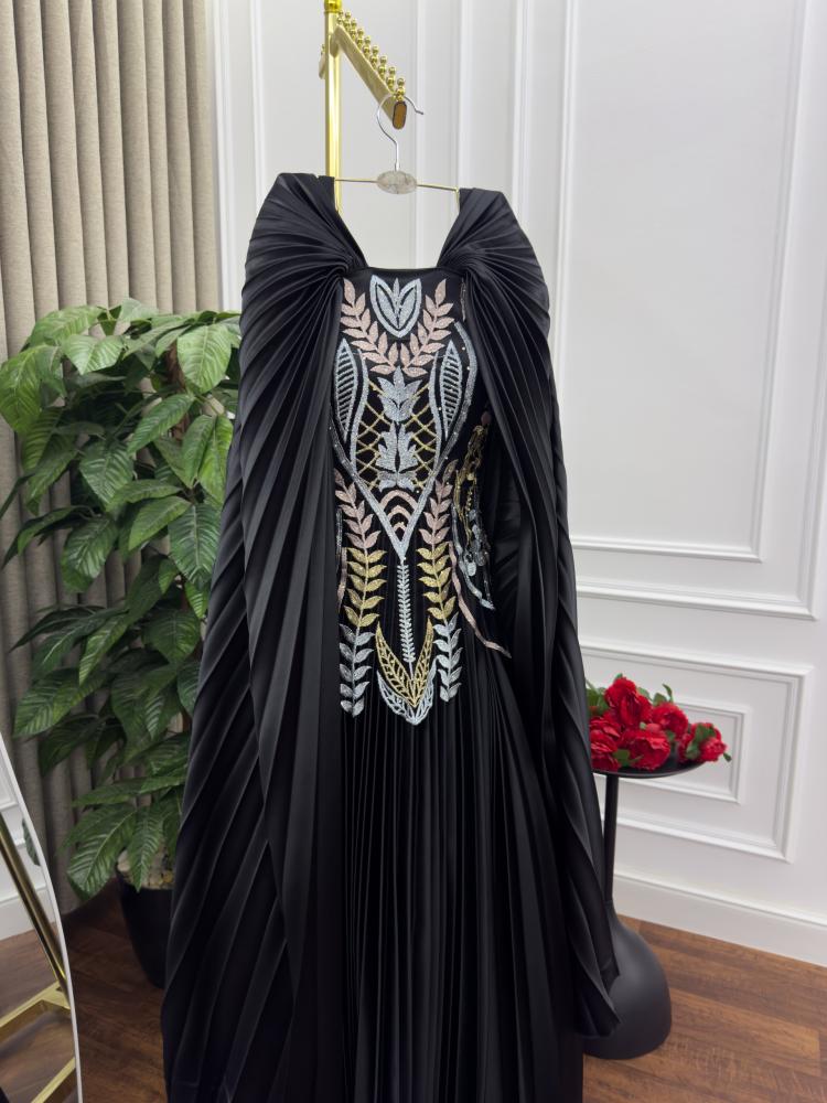 التصميم: قصة واسعة بانسيابية مريحة، مع أكمام طويلة وتطريز بارز في المنتصف يضفي لمسة ملكية.