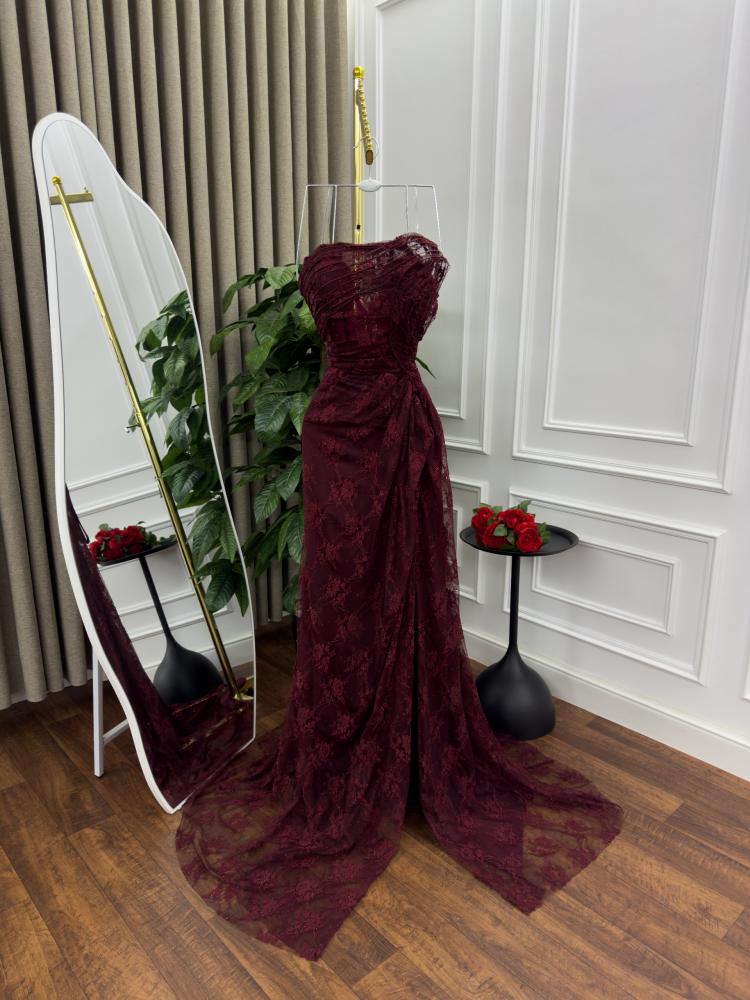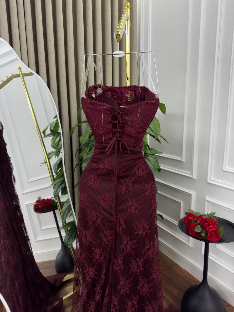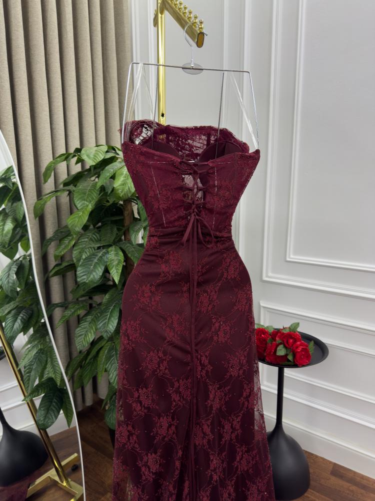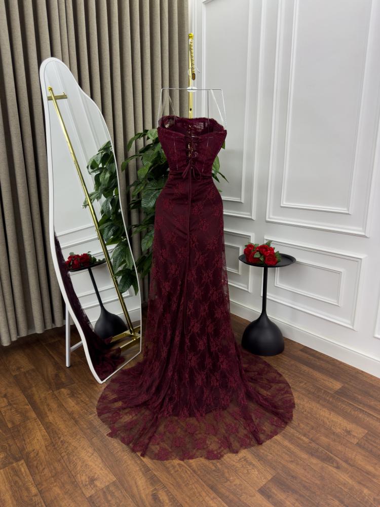 - القَصّة: بدون أكمام، صدر ضيق وتنورة مستقيمة مع ذيل طويل، تصميم يبرز القوام ويمنح حضورًا ملكيًا