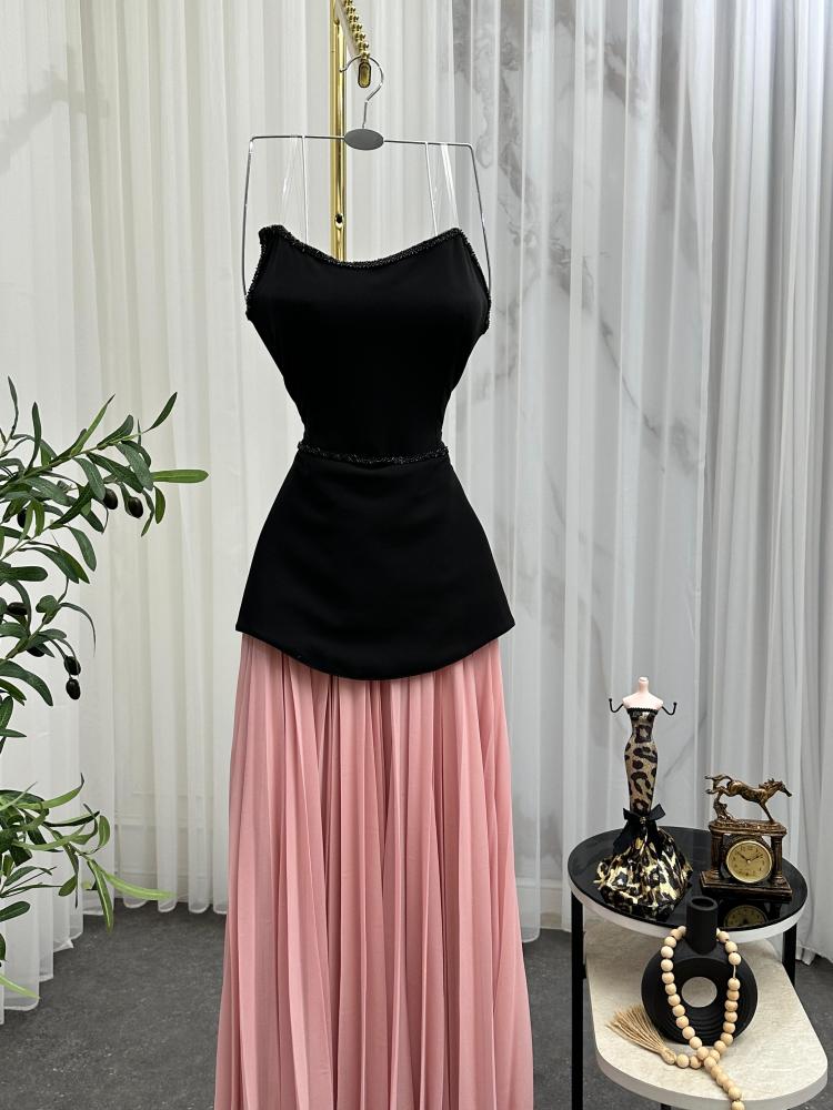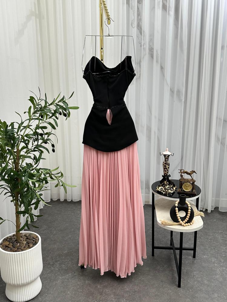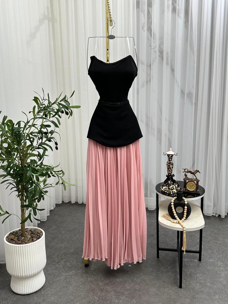 - الخامة: توب من قماش مطاطي أسود مع تنورة شيفون وردية خفيفة، تجمع بين الثبات والنعومة