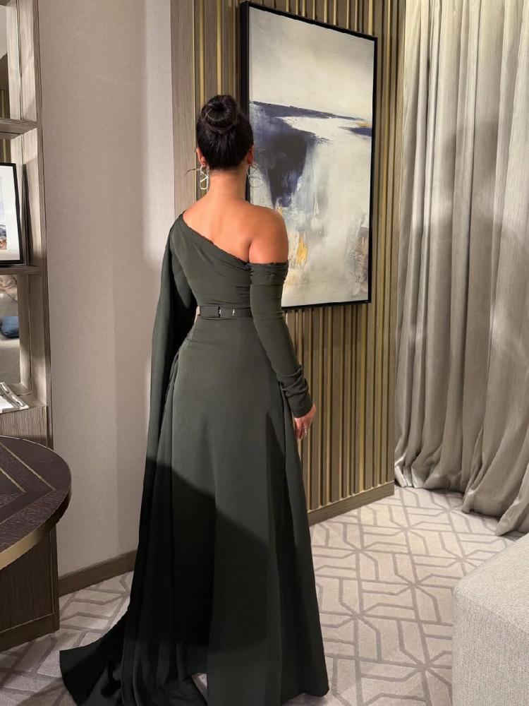 فستان سهرة بلون زيتوني غامق بجرأة وأناقة