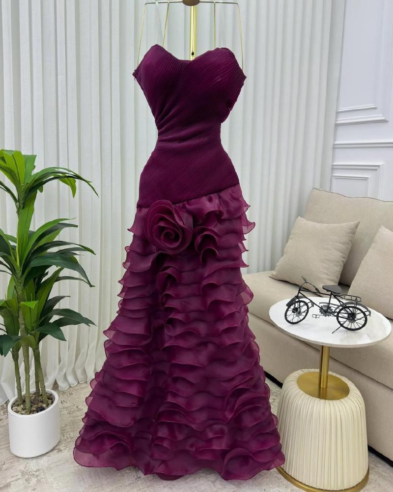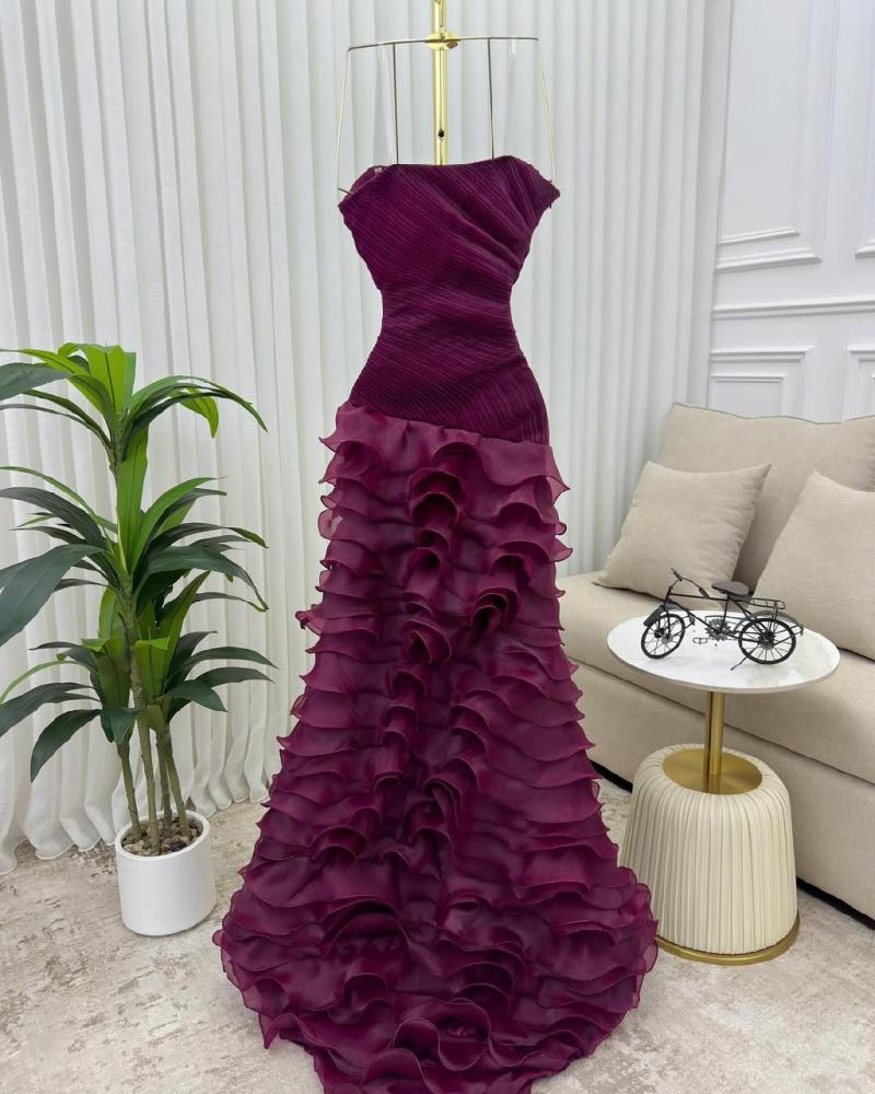 - القَصّة: اوف شولدر بدون أكمام، صدر ضيق وتنورة حورية بكشكش متدرج