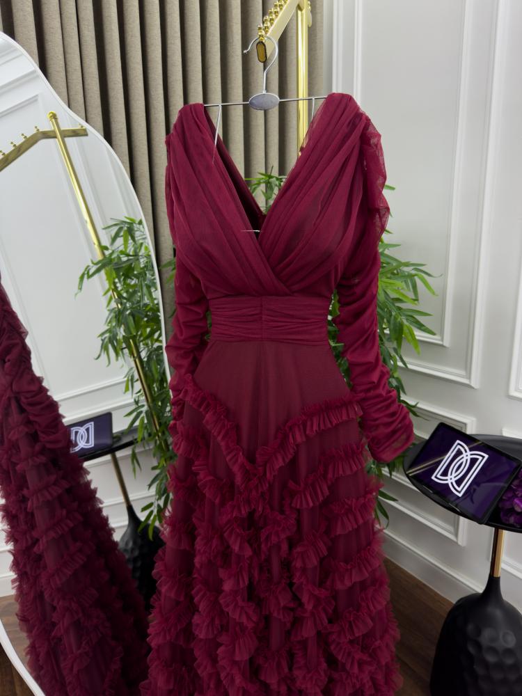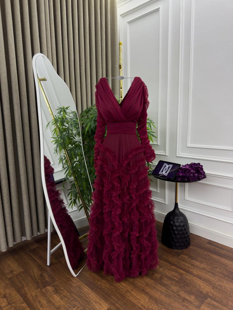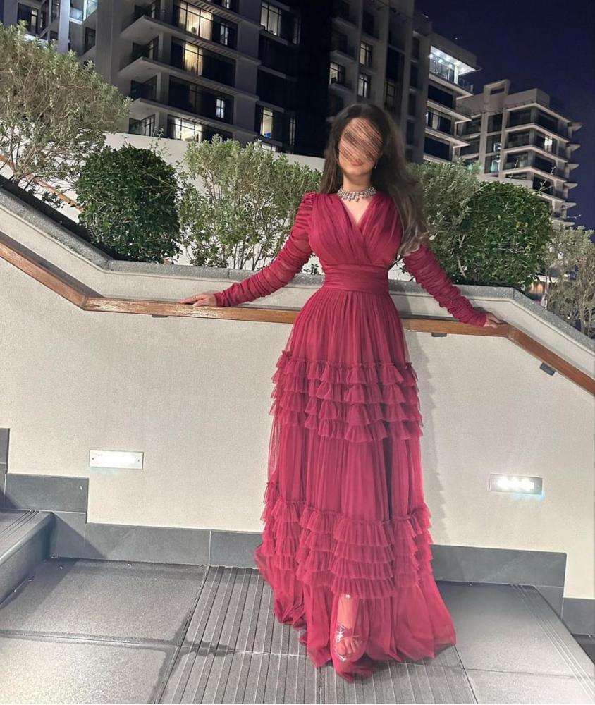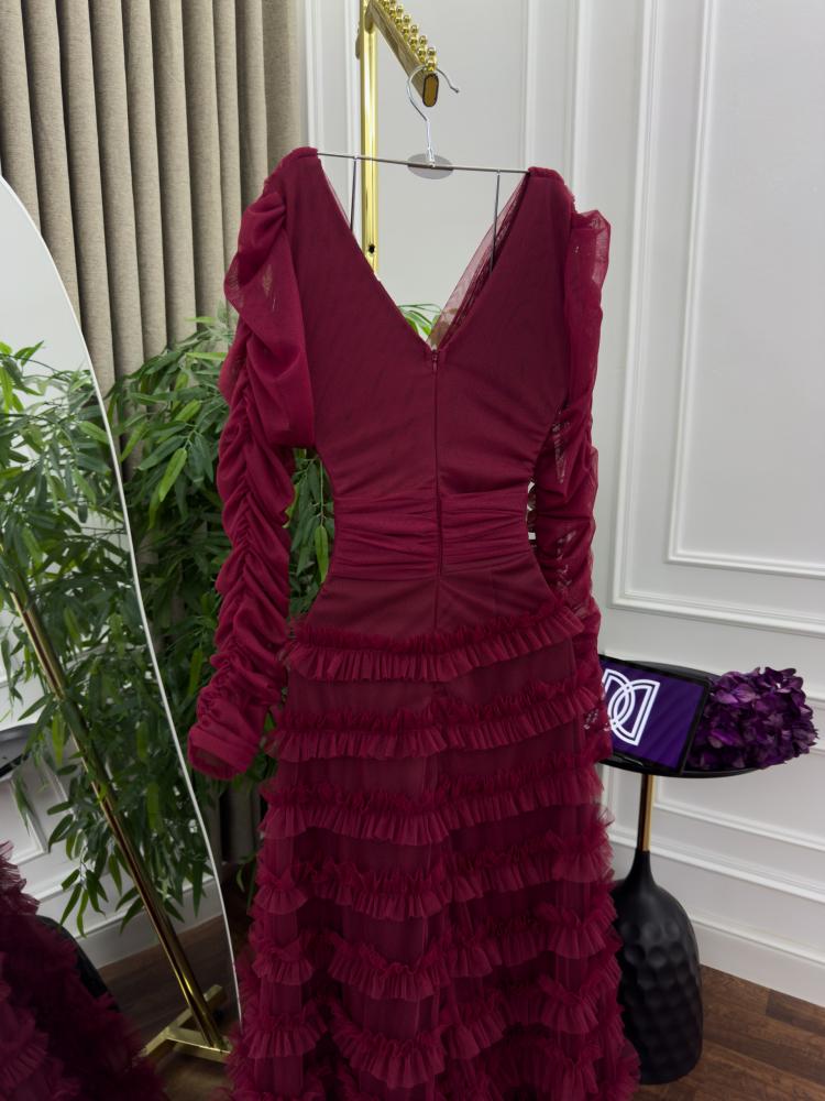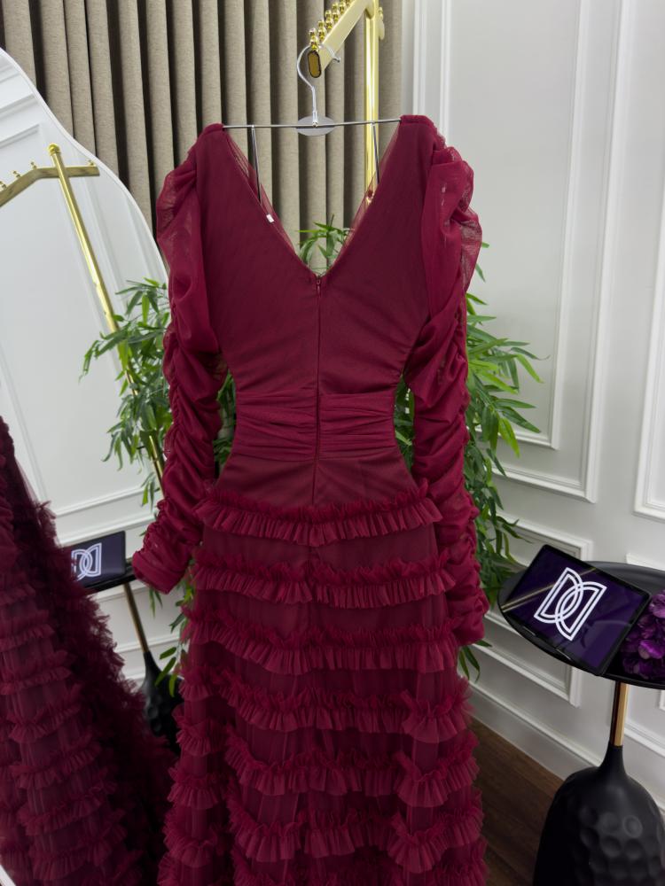 - القَصّة: بأكمام طويلة وياقة V، بقصة حورية ضيقة وتنورة بطبقات كلوش