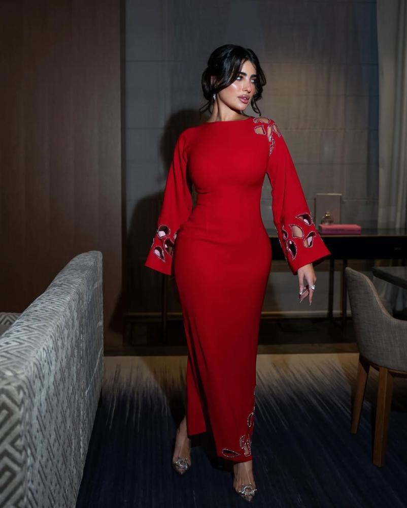 فستان أحمر ماسك بتفاصيل تطريز ، تصميم كلاسيكي فاخر بقصة ماسك تبرز القوام بأسلوب جذاب.
