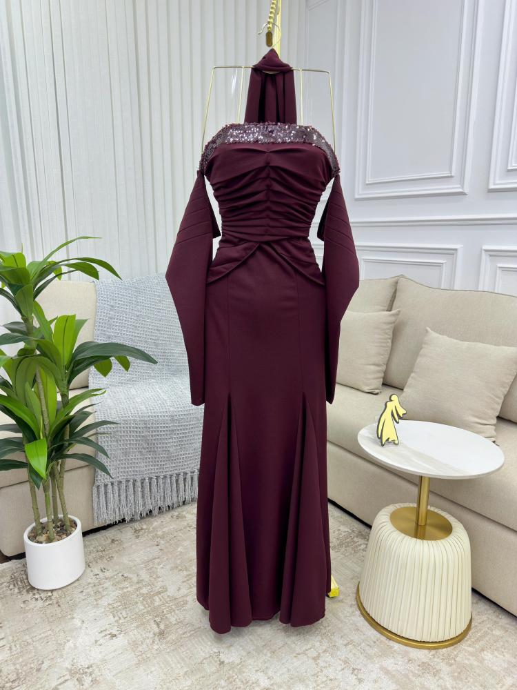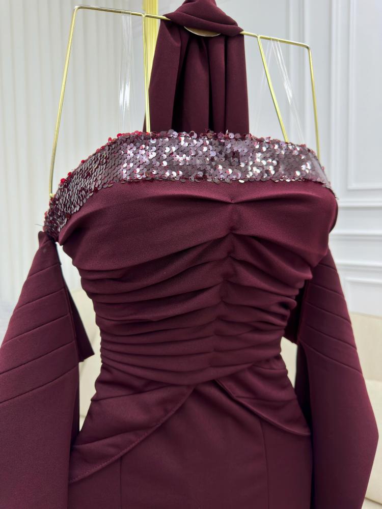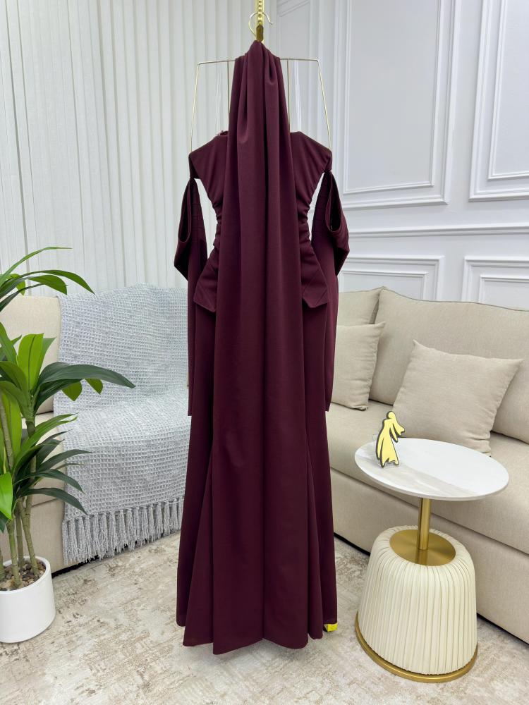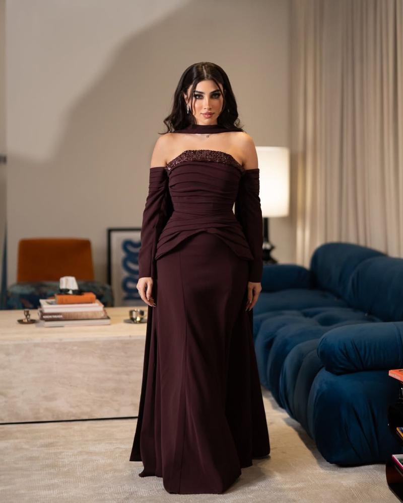 - القَصّة: أوف شولدر، صدر ضيق مع ثنيات تنسدل بانسيابية حتي الخصر وتنورة واسعة