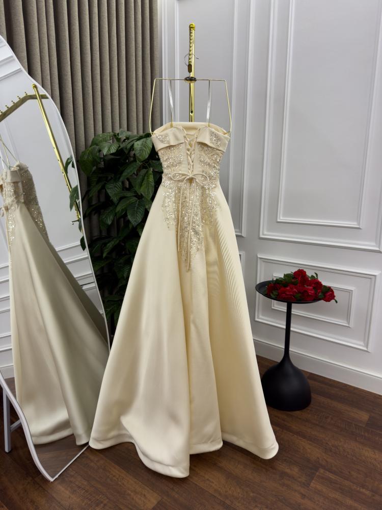 التصميم: قصة اوف شولدر منفوشة بدون أكمام بلمسة ملكية.