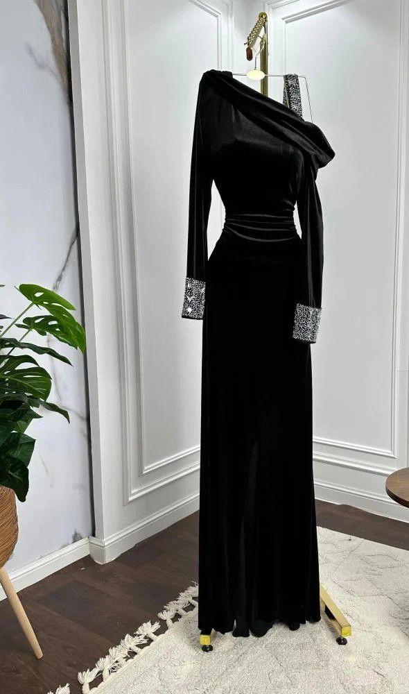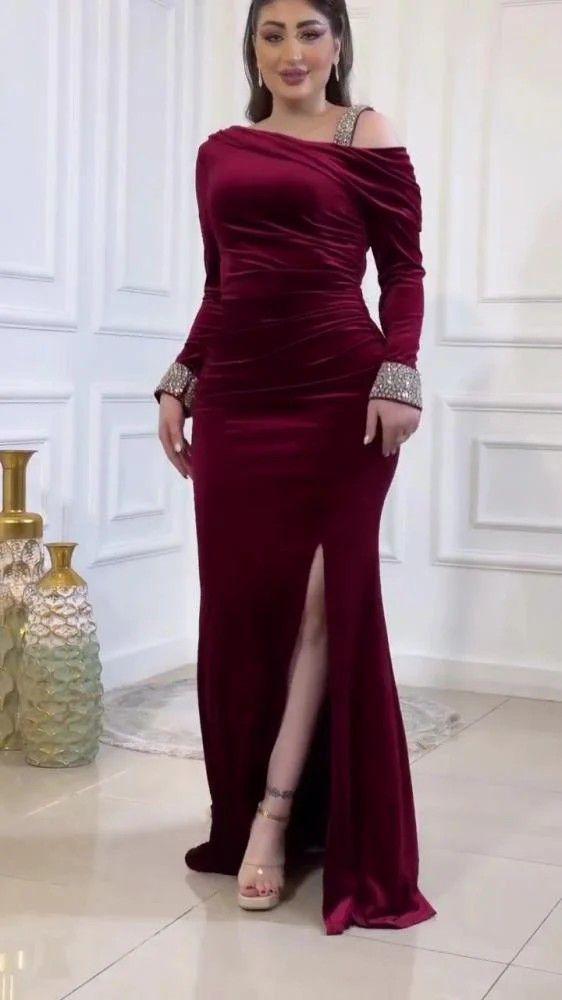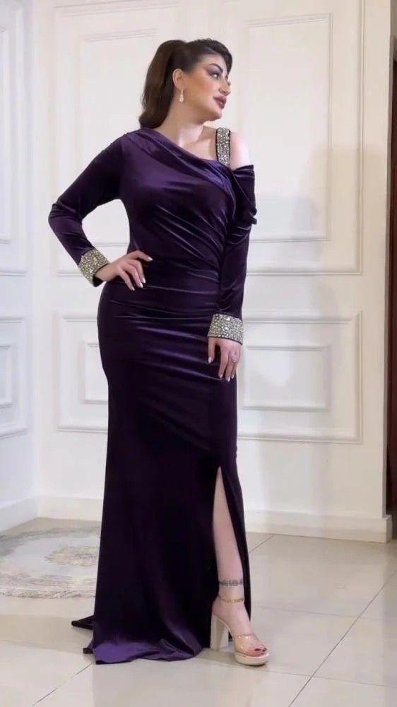 فستان موف بكم واحد طويل وقصة ماسك مع فتحة جانبية أنيقة.