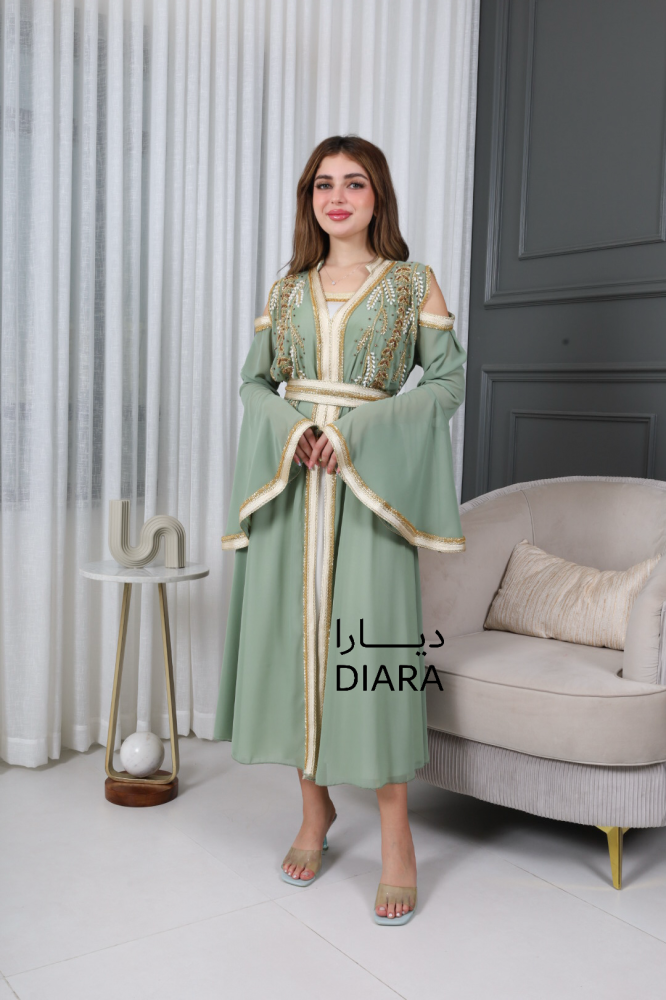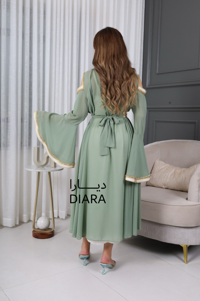 احصلي على إطلالة مفعمة بالأناقة مع جلابية ديارا باللون الأخضر الفاتح المزودة بتطريزات ذهبية أنيقة.