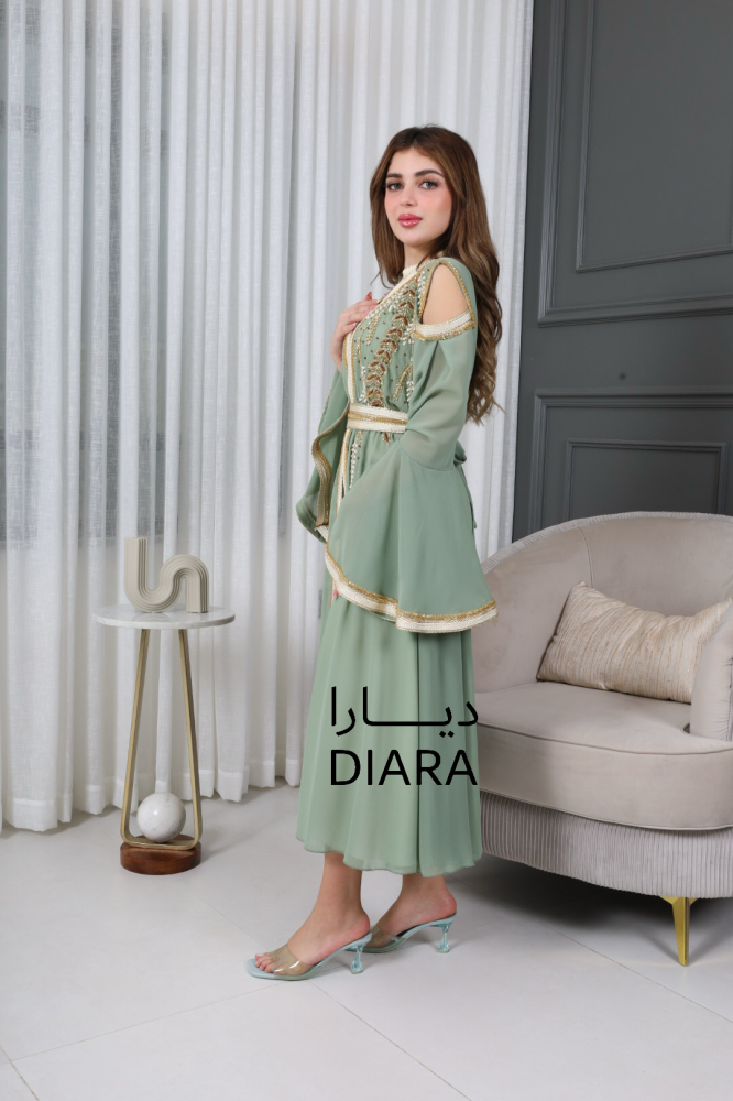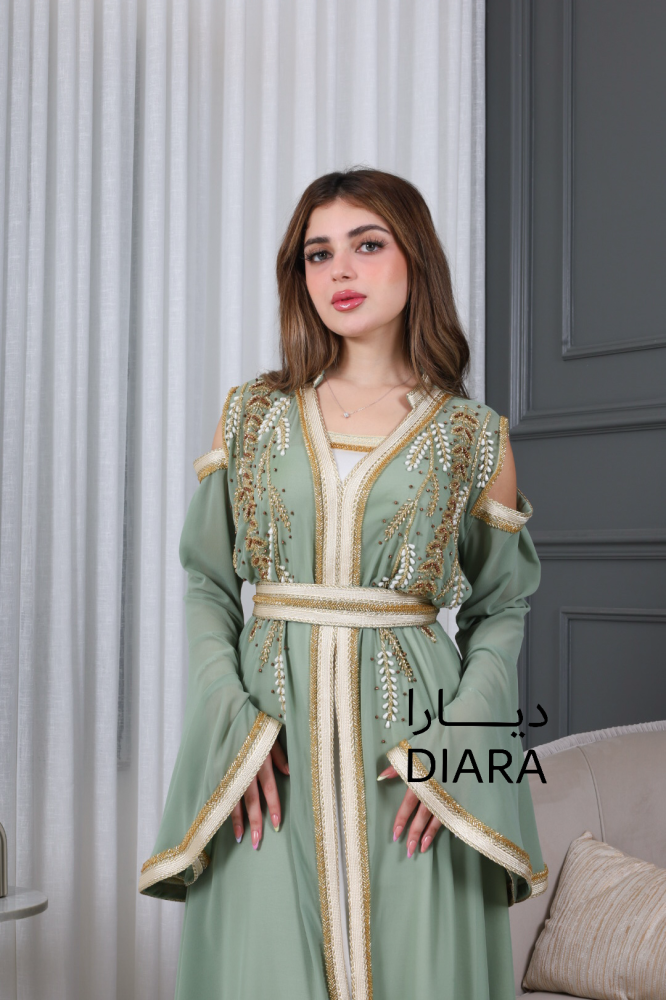 اللون: أخضر فاتح مع تطريز ذهبي.