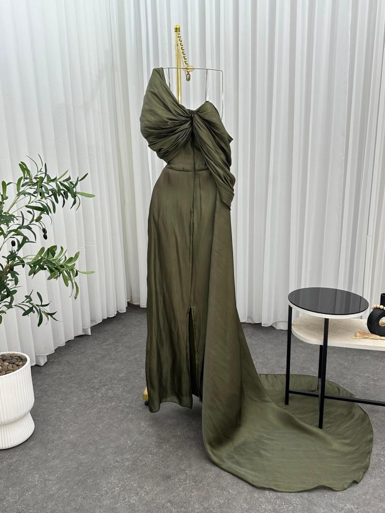 - القَصّة: ون شولدر بتصميم غير متناظر، بقصة ضيقة من الأعلى وتنورة بشق جانبي تضيف جرأة وأناقة