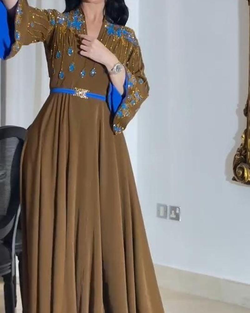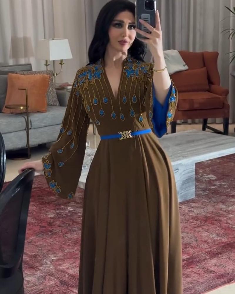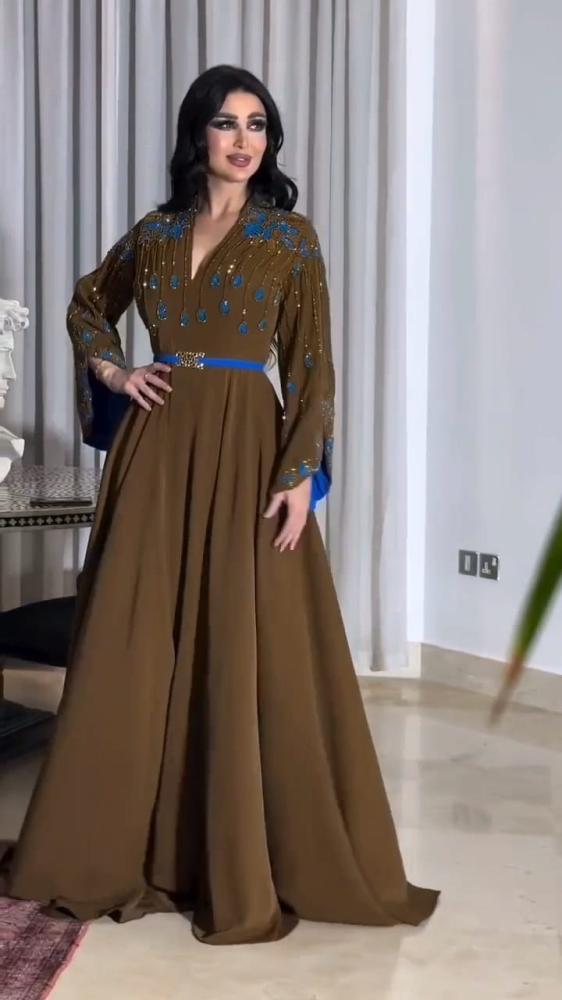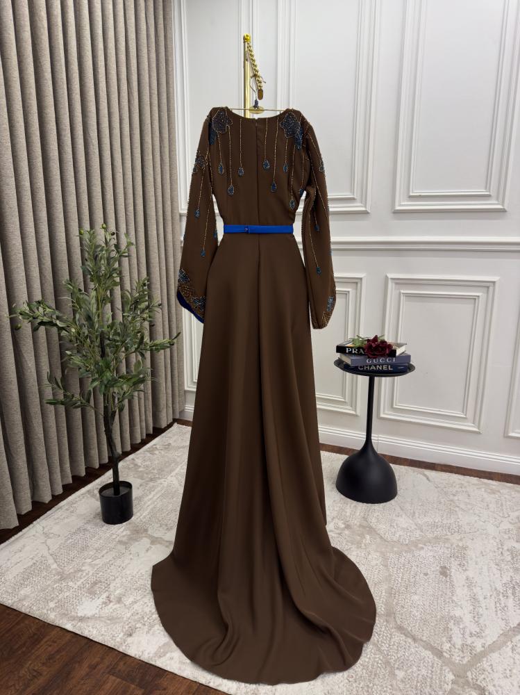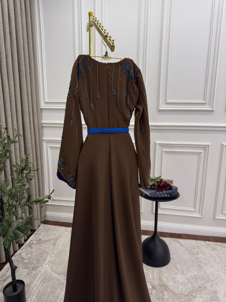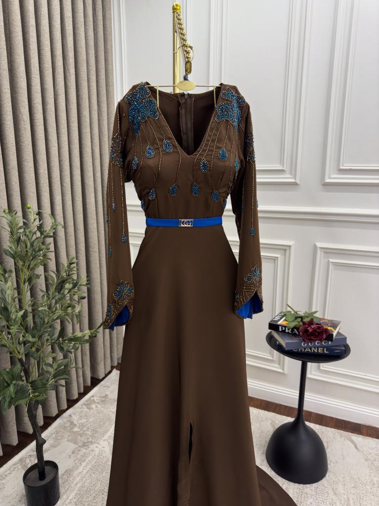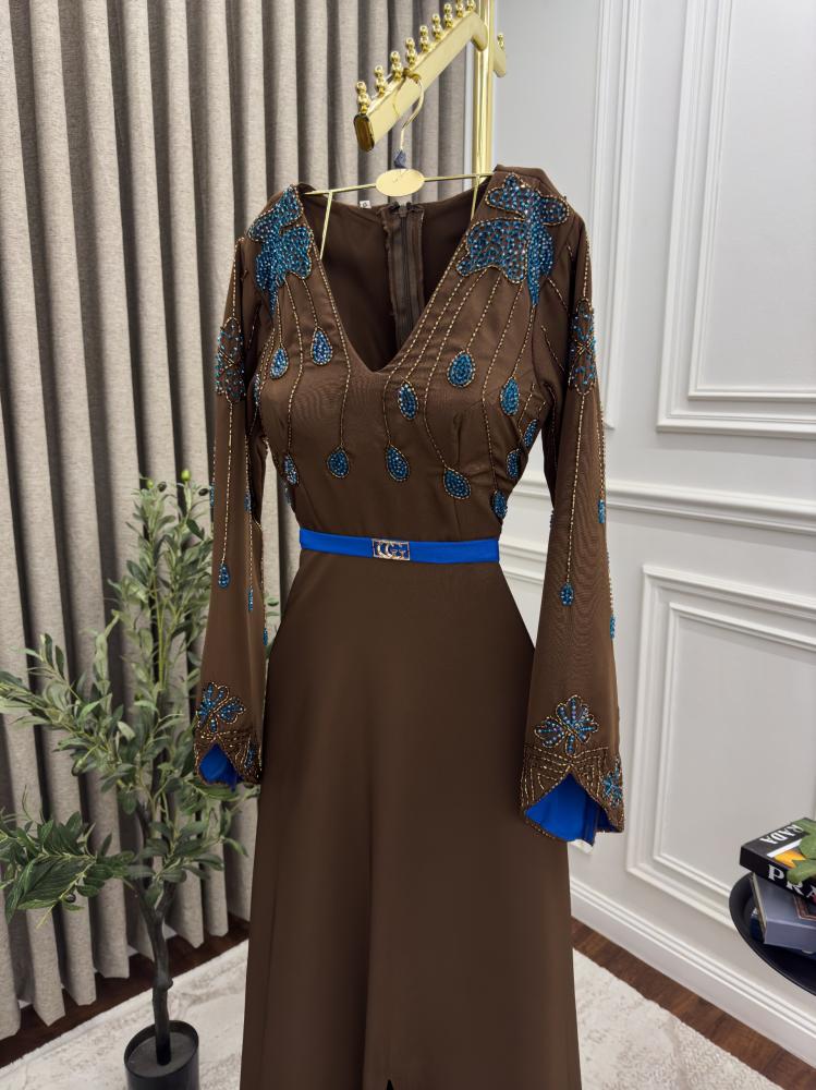فستان بني واسع بتطريز ناعم ، بخامة كريب ناعم بانسيابية أنيقة، بقصة واسعة تضمن الراحة والفخامة.