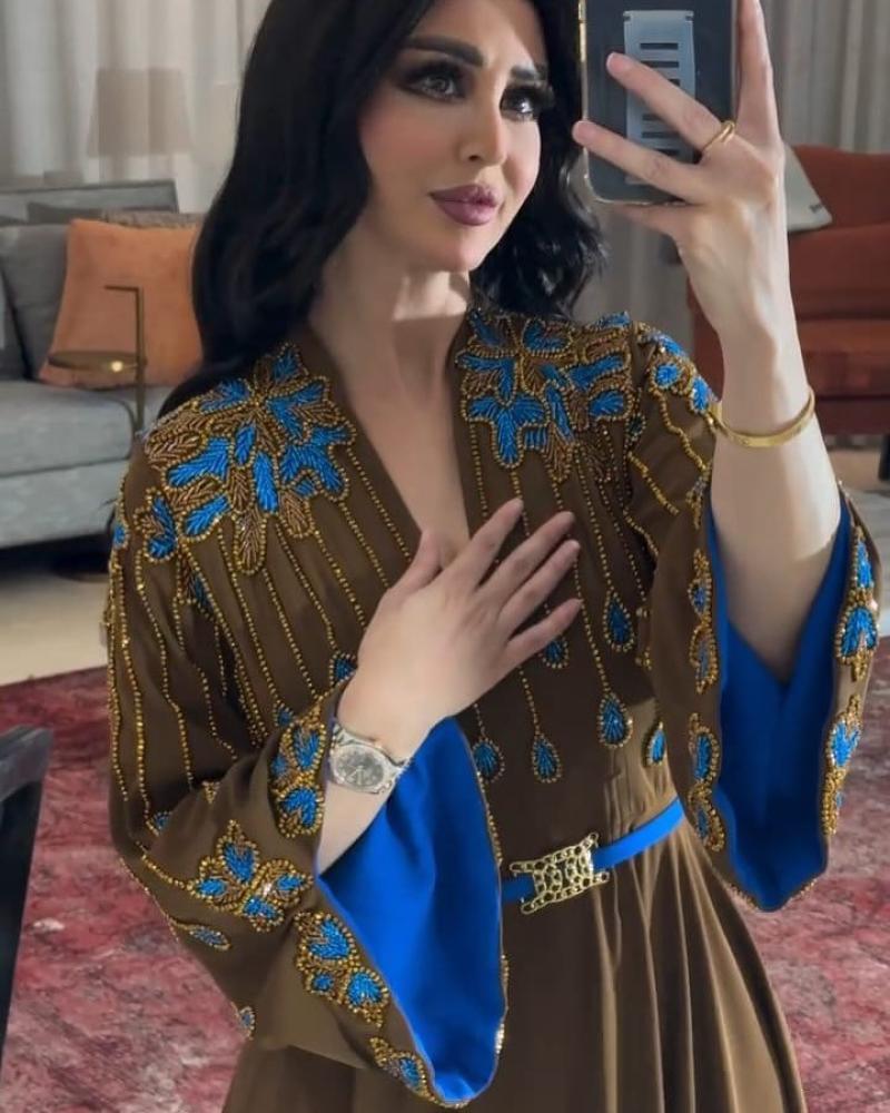 الأكمام طويلة وواسعة مع حزام خصر يحدد القوام برقي.