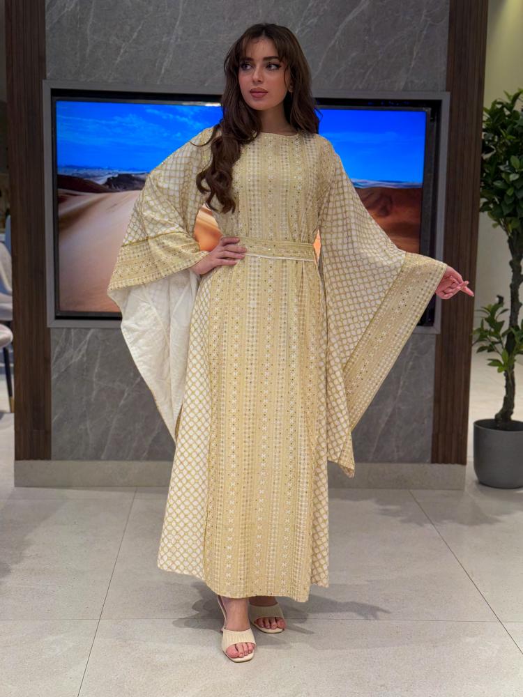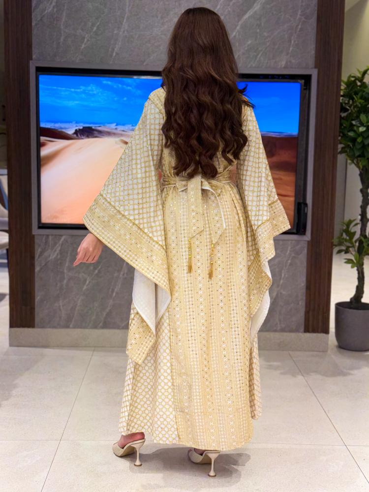 اللون: بيج فاتح بتطريزات ذهبية أنيقة.