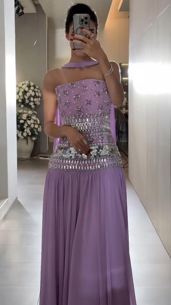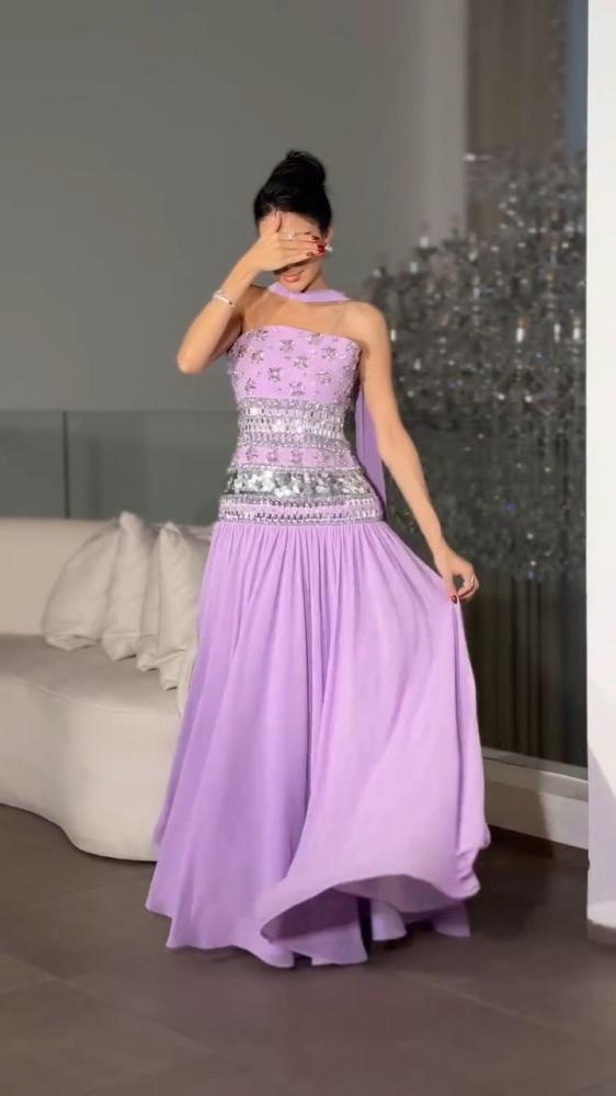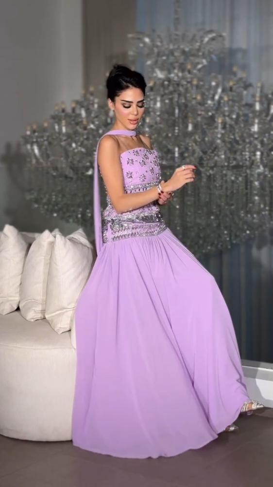- الخامة: شيفون مطرز بخيوط وردية، مع بطانة ساتان