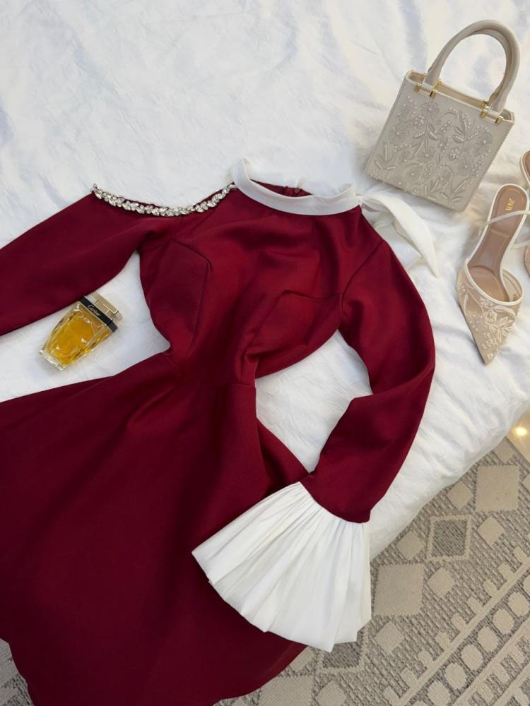 اللون: خمري مع تفاصيل بيضاء أنيقة عند الأكمام والياقة.