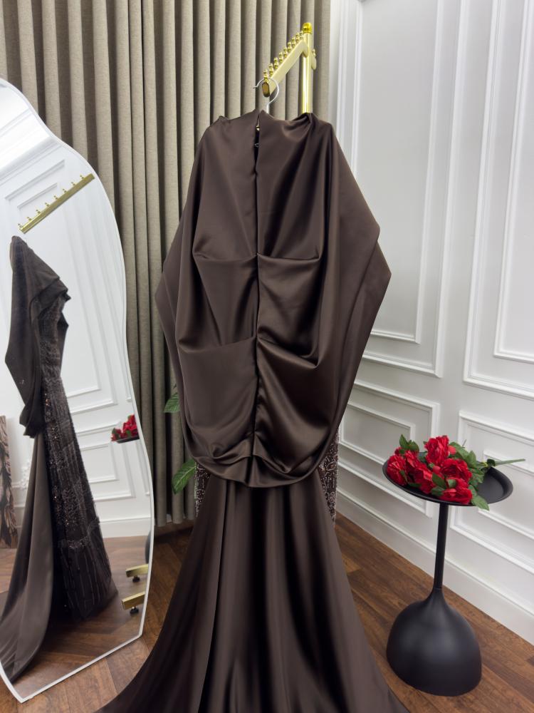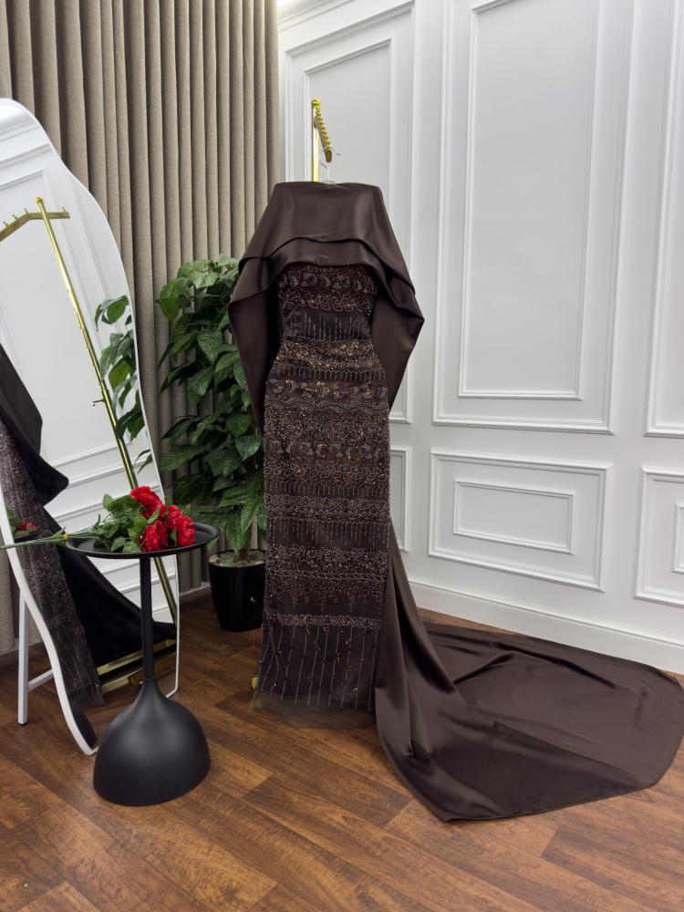 التصميم: قصة ضيقة مزود بكاب عند الاكتاف مع ذيل طويل فاخر مطرز بالكامل ليعكس جمال القوام.