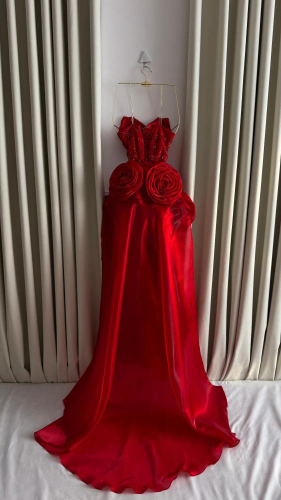 فستان سهرة كلفه مطرز مع اكمام اورجنزا مورد