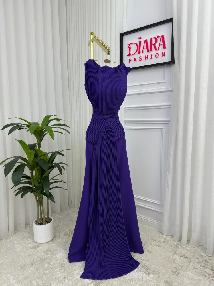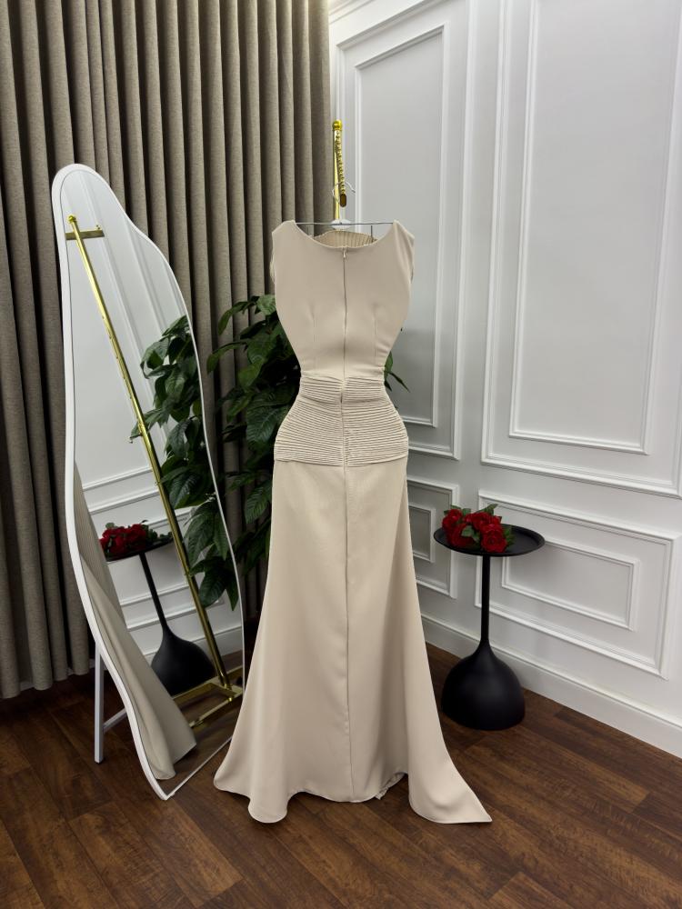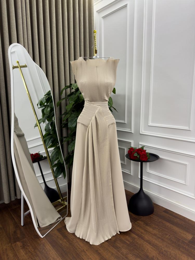 - القَصّة: ياقة مغلقة، بدون أكمام، صدر ضيق وتنورة كلوش منسدلة وبه ثنيات علي الصدر والخصر