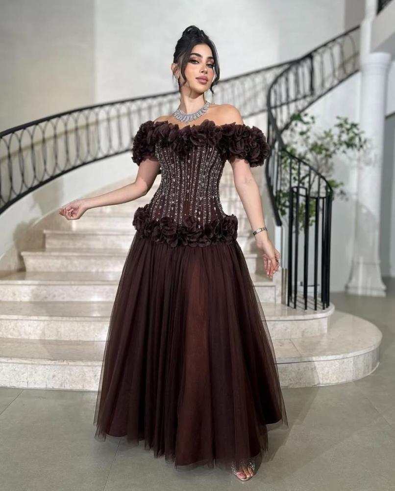 فستان سهرة طويل بني مزين بتل وكرانيش على الكتف من فخامة، مع كورسيه بفيونكات بارزة مع أكتاف مكشوفة، بتصميم كلاسيكي أنيق.