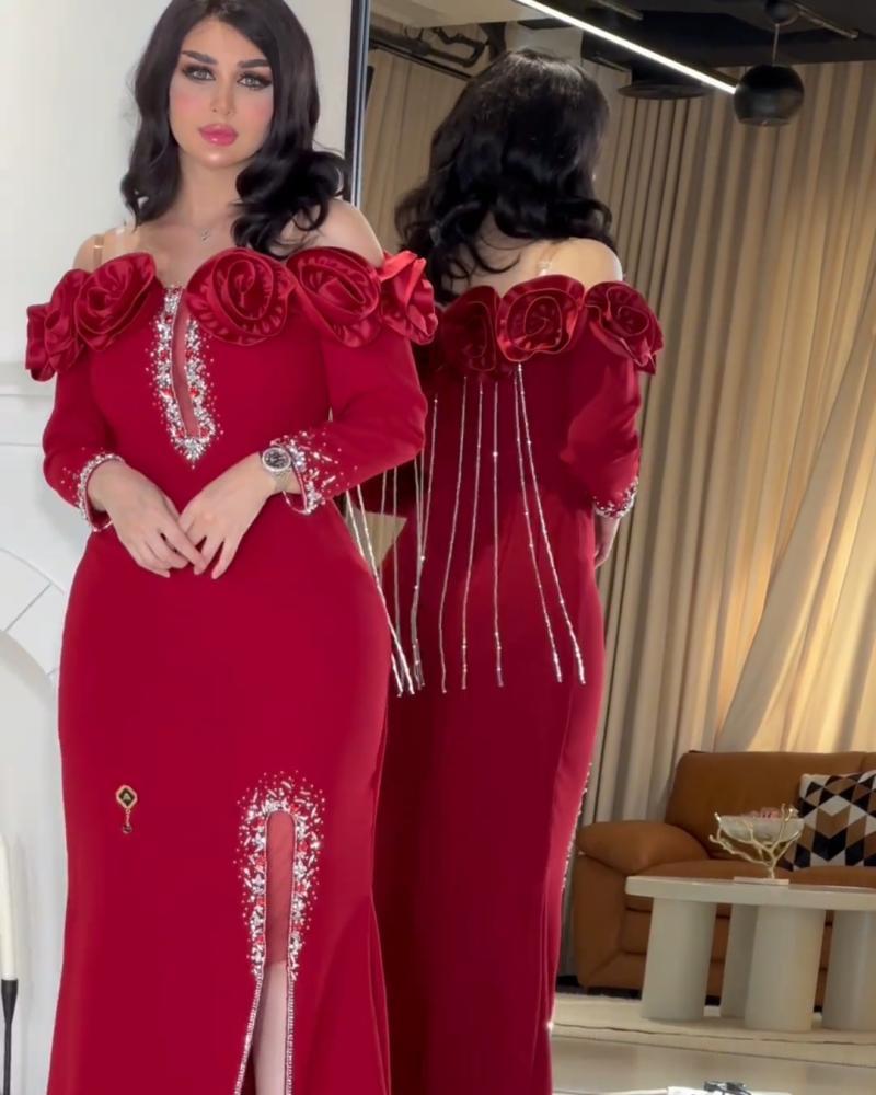 - القَصّة: أوف شولدر بأكمام طويلة وقصة حورية تبرز تفاصيل الجسم بأسلوب راقٍ