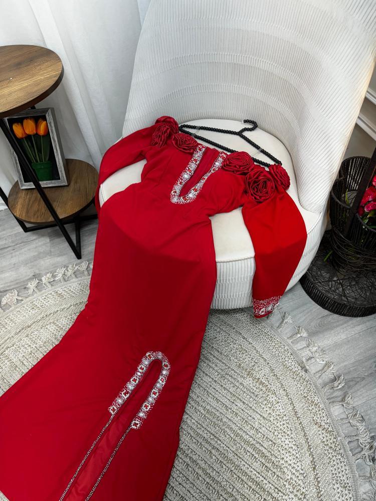 - الخامة: كريب ثقيل مزين بتطريز ثلاثي الأبعاد على الأكتاف والأكمام، يمنح الفستان فخامة استثنائية