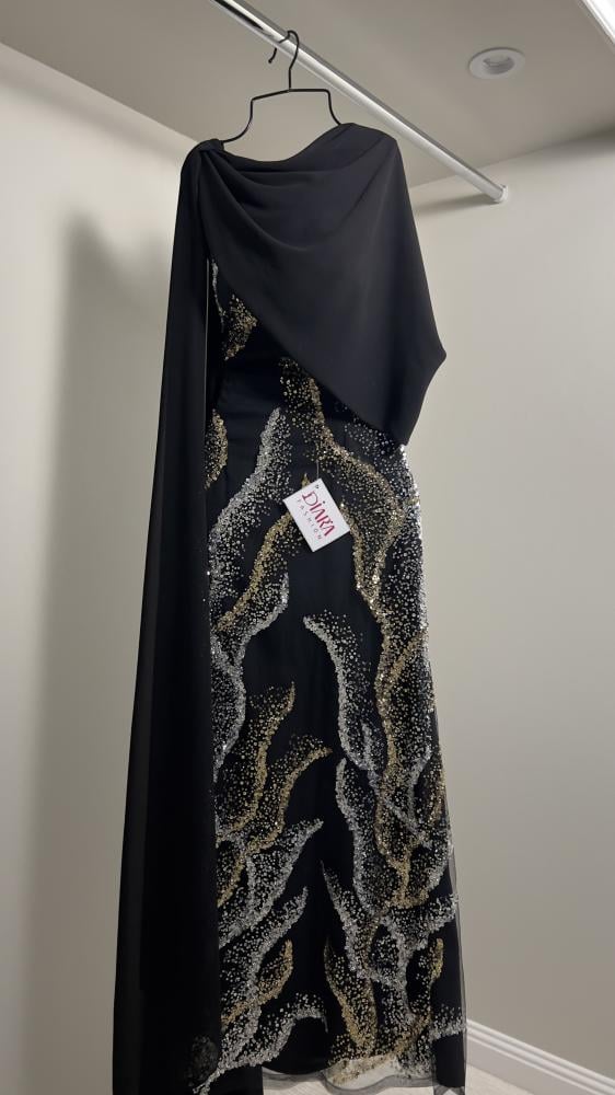 فستان أسود مطرّز بخيوط ذهبية وفضية تمنحك حضور لافت وأناقة راقية، مع شال متدلٍ يضيف لمسة فخامة وانسيابية.