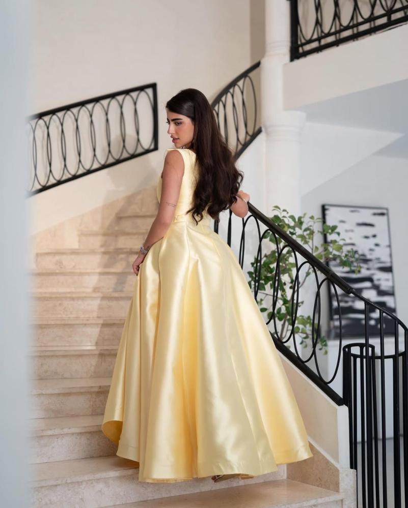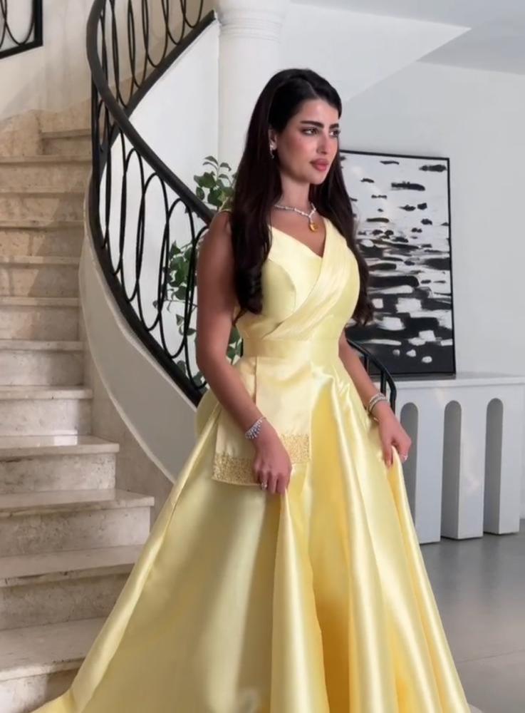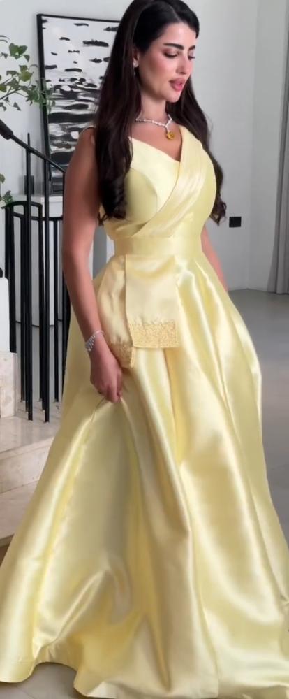 فستان سهرة بلون أصفر ساتان بإشراقة ناعمة