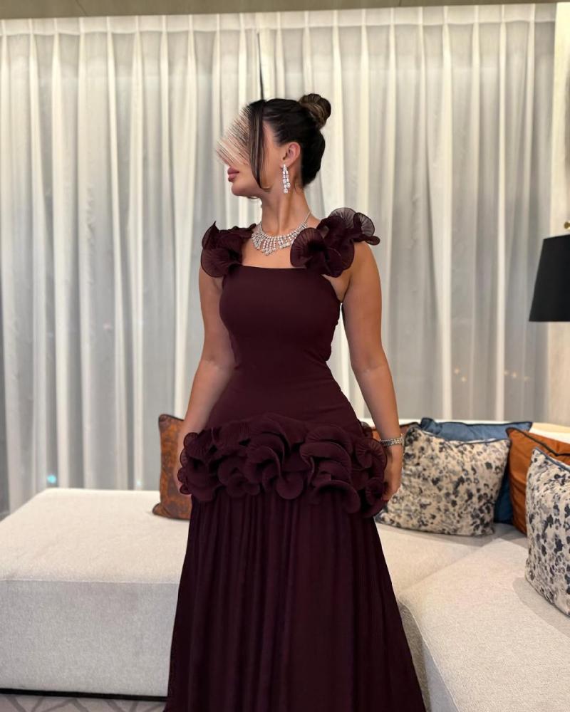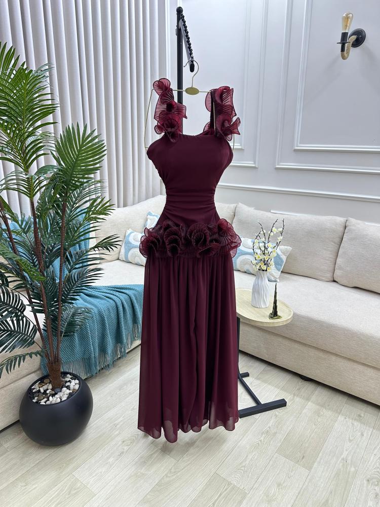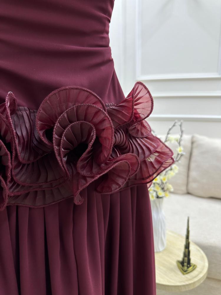 - الخامة: ميكادو ماروني مع تطريز وردي على الخصر