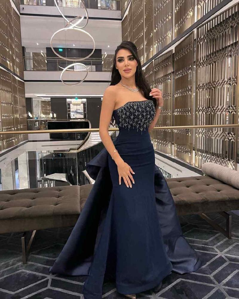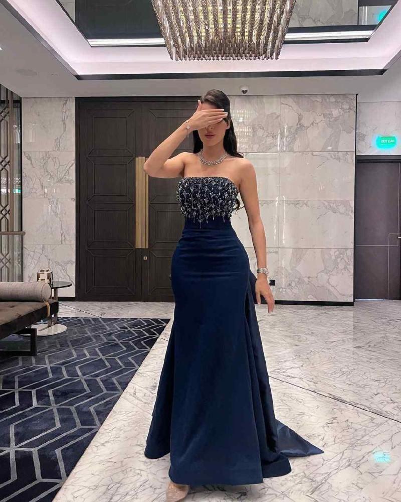 فستان توب بلون كحلي بحبات كريستال – بقصة ماسك مع ذيل خلفي أنيق. مصنوع من قماش مخملي فاخر، مزين بحبات كريستال براقة عند الصدر. التصميم يبرز جمالك برقي. لمعان ناعم لإطلالة تخطف القلوب!