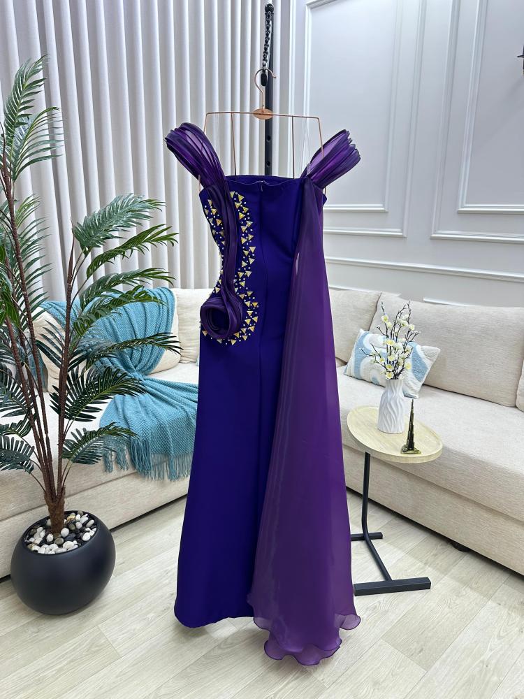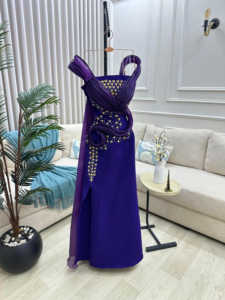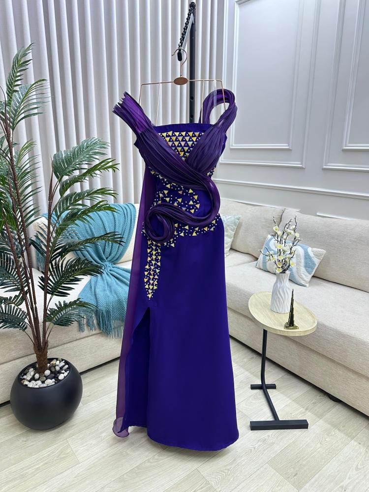 - القَصّة: صدر ضيق وتنورة مستقيمة بشق جانبي، تصميم يبرز القوام ويمنح لمعة ساحرة