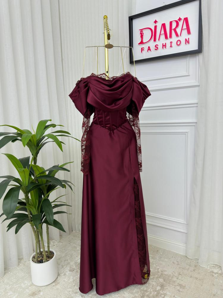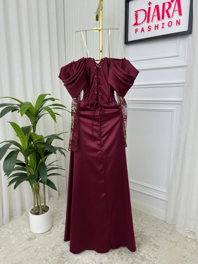 فستان سهرة خمري بأكمام منفوشة وأناقة ملكية