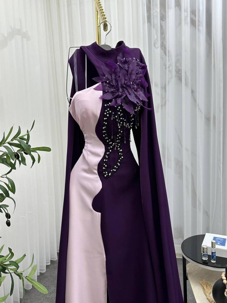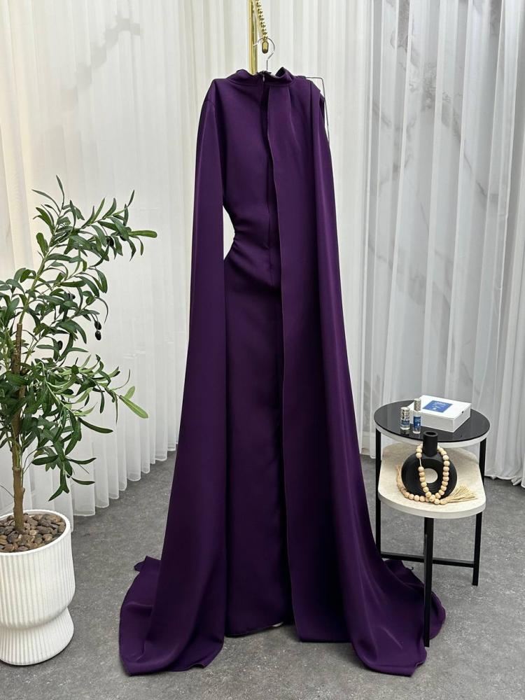 - القَصّة: ون شولدر وبدون أكمام، صدر ضيق وتنورة ماسكة بشق جانبي، مزود بكاب علي كم واحد طويل تصميم يبرز القوام ويمنح لمعة فاخرة
